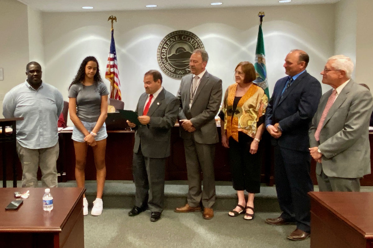 A sophomore at Catskill High School, Janay Brantley became the all-time leading scorer in the history of the CHS Girls Basketball program. At the end of this season, Janay has 1,099 career points with two more years to play! (Presenting the award is Greene County Legislator Matt Luvera (District 1 – Catskill) and to his left: Chairman Linger (Distirct 5 – New Baltimore) and Legislators Linda Overbaugh, Michael Bulich and Jack Keller of Catskill.) See Janay’s Commendation