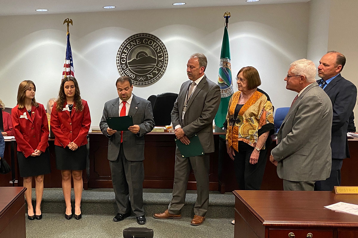 High School students Lauren Liberti & Emma Brown were chosen by the board of Family, Career, and Community Leaders of America (FCCLA) to serve on the NYS Executive Council as President and 1st Vice President/Peer Educator respectively. (Presenting the award is Greene County Legislator Matt Luvera (Distirct 1 – Catskill) and to his left: Chairman Linger (District 5 – New Baltimore) and Legislators Linda Overbaugh, Michael Bulich and Jack Keller of Catskill.) See Lauren & Emma’s Commendation