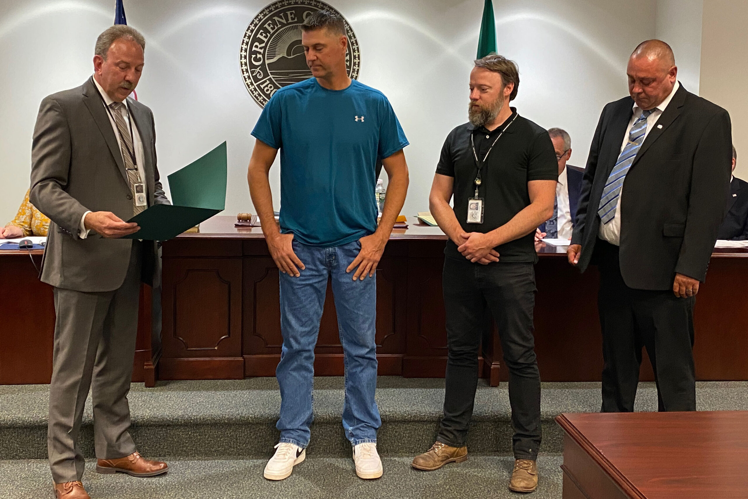 County Highway employee James Young was commended in recognition for his bravery in rescuing a motorist stranded in thigh-high floodwaters covering Route 23B in Leeds on Christmas Day, 2020. (Chairman Linger presenting with Public Works Committee Chair Jim Thorington, District 6 – Prattsville, Ashland, Windham, Jewett.) See James’ Commendation