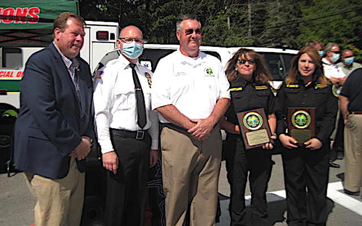 Davia Montie and Nancy Montesano were honored, respectively, as the 1st and 2nd paramedics hired by Greene County Emergency Medical Systems, 20 years ago. Taking part in the presentation of special plaques were (left to right) Assemblyman Chris Tague, GCEMS chief of operations Steve Brucato, GCEMS president Mark Evans, Montesano and Montie (who also serves as administrator of the Windham Ambulance Corps.