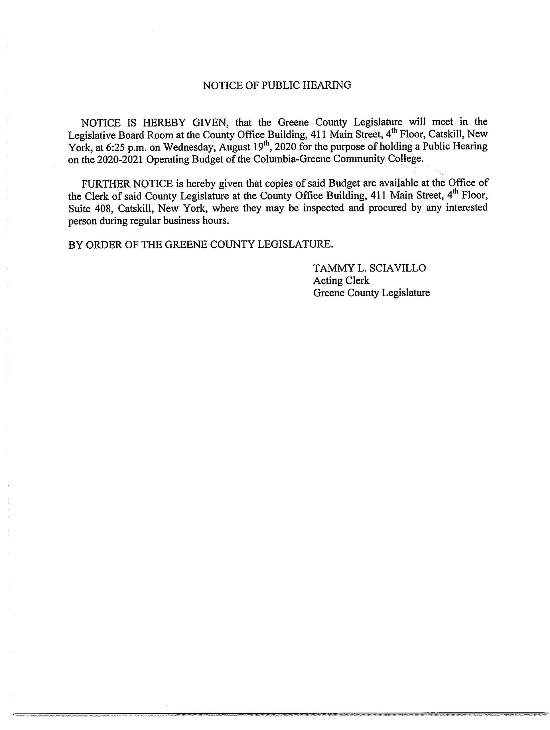 Notice of Public Hearing – Operating Budget of the Columbia-Greene Community College