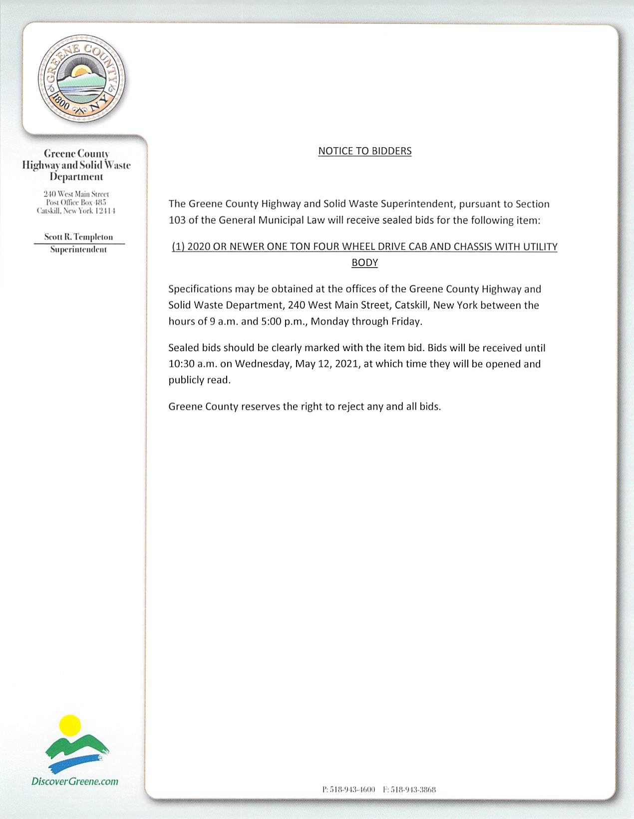 Notice To Bidders – 2020 or Newer One Ton Four Wheel Drive Cab & Chassis w/Utility Body