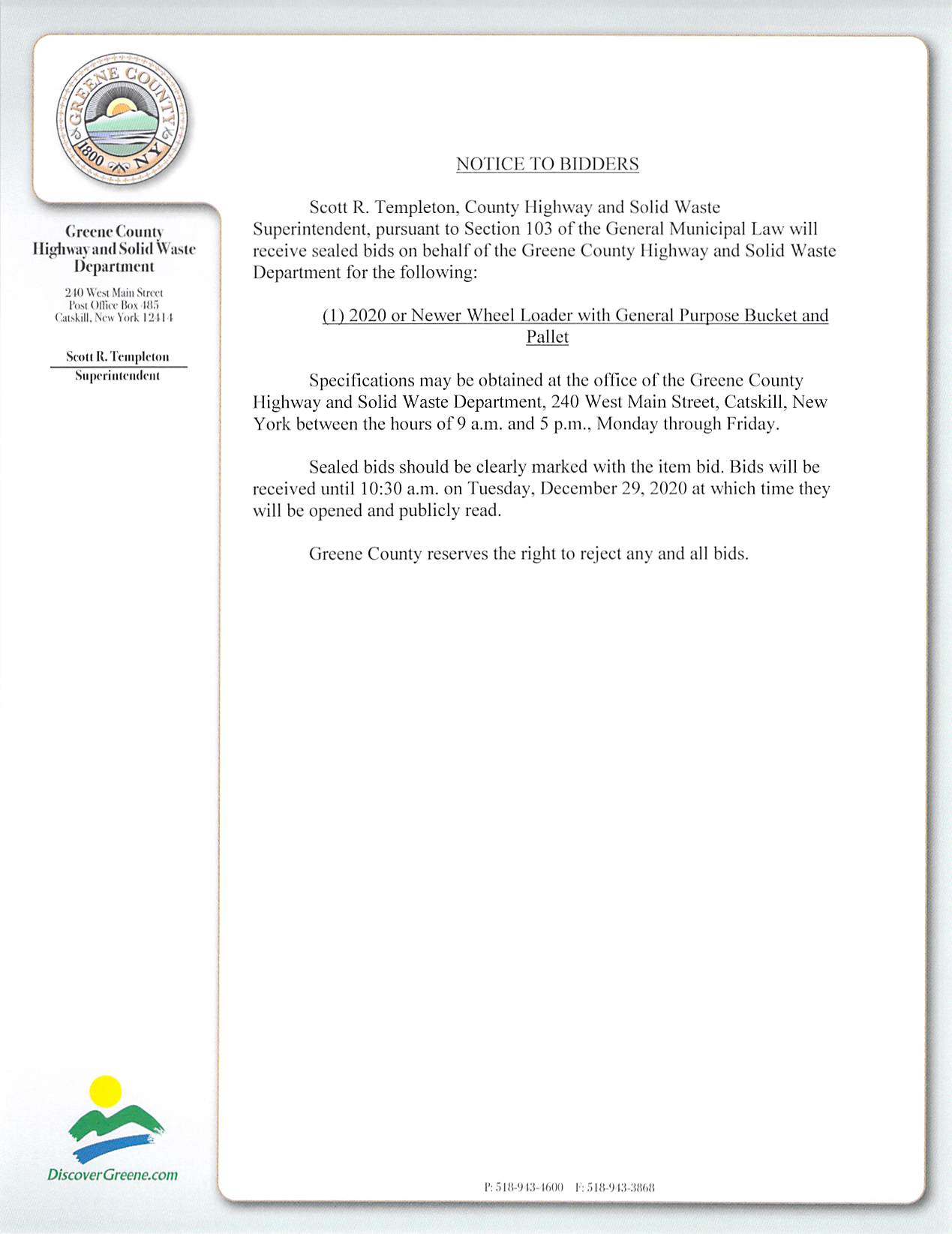 Notice To Bidders – 2020 or Newer Wheel Loader with General Purpose Bucket & Pallet