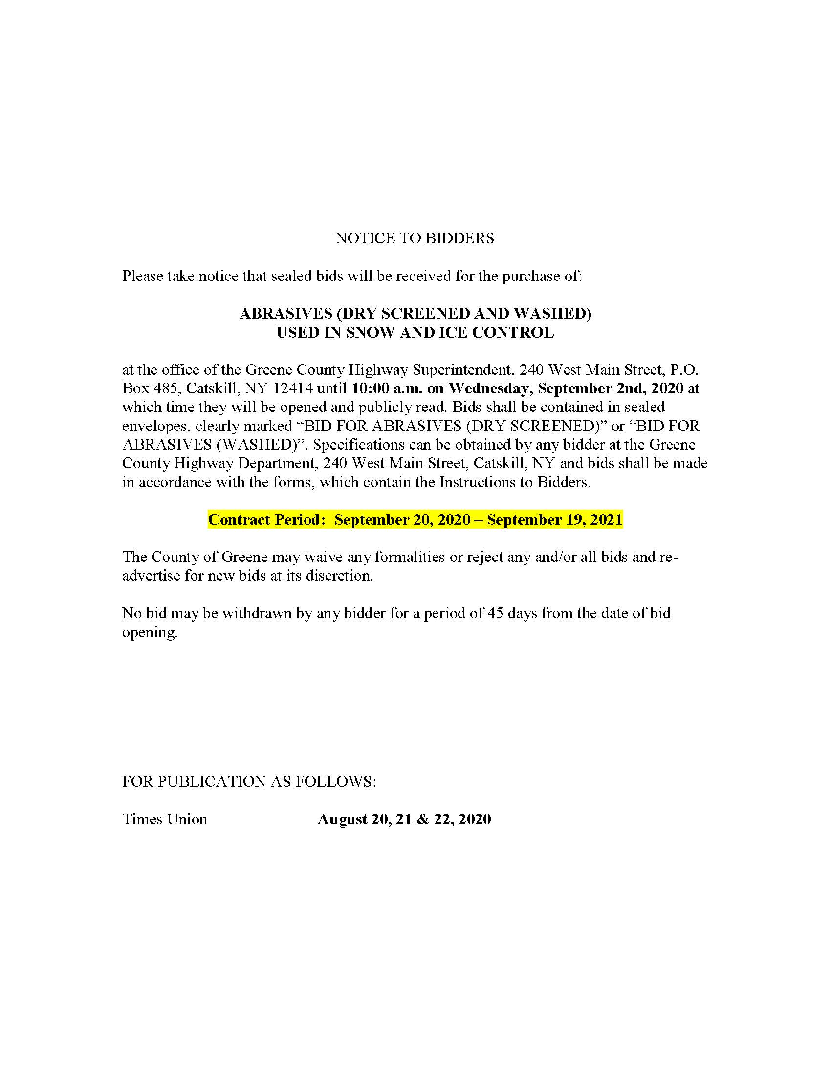 Notice To Bidders – Abrasives (Dry Screened & Washed) Used In Snow & Ice Control