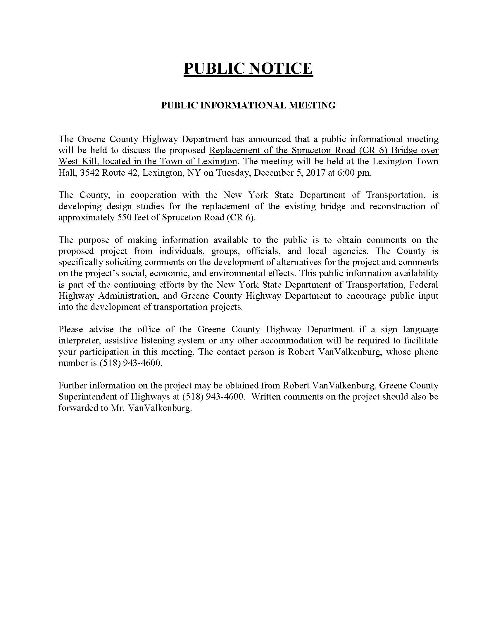 Public Notice – Public Informational Meeting – Replacement of the Spruceton Road Bridge