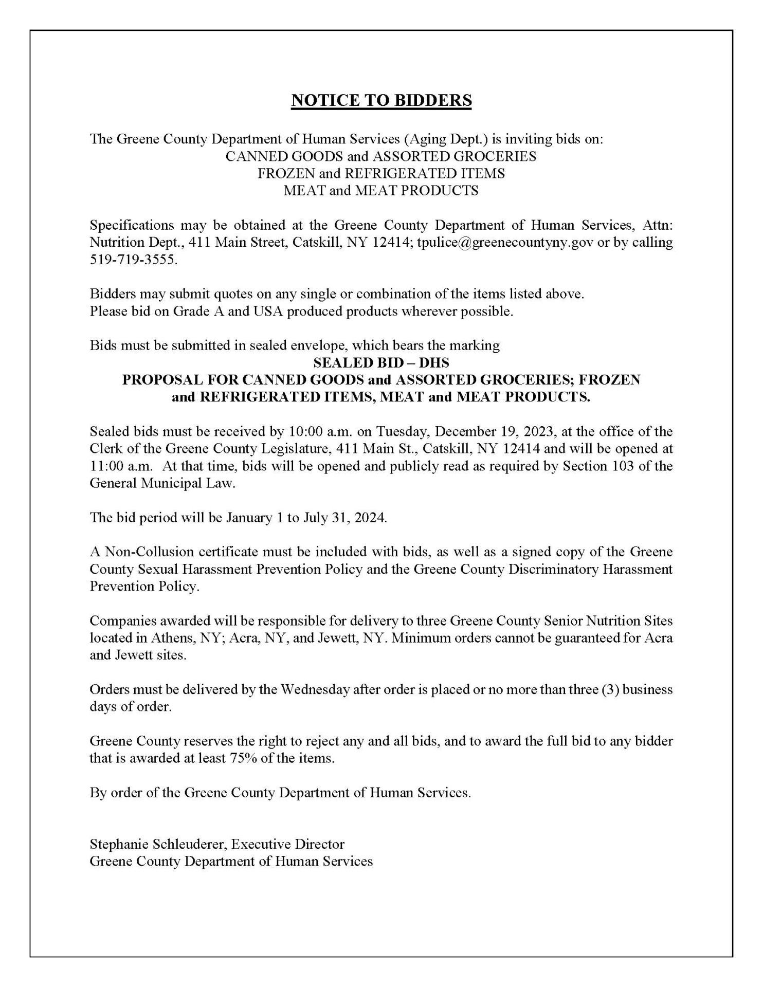 Notice to Bidders – Canned Goods & Assorted Groceries – Frozen & Refrigerated Items – Meat & Meat Products